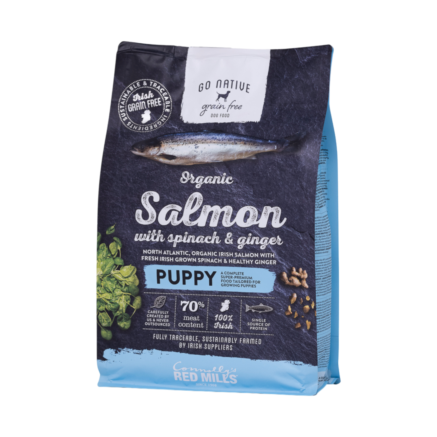 Go Native – Puppy: ekologiczny łosoś ze szpinakiem i imbirem to doskonały wybór dla rosnącego szczenięcia. Karma ta zawiera 70% pysznego, ekologicznego, irlandzkiego łososia.