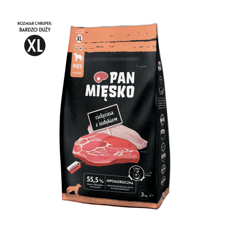 Poznaj hipoalergiczne suche karmy dla psów Pan Mięsko. Wyróżniają je starannie wyselekcjonowane mięsa z dodatkiem soczystych polskich jabłek, zdrowych warzyw i cennych składników odżywczych, które pozytywnie wpłyną na zdrowie oraz kondycję Twojego psa. Nasze receptury zostały przygotowane przez specjalistów, po to, aby dostarczyć Twojemu czworonożnemu towarzyszowi dokładnie to, czego potrzebuje. Twój pies zasługuje na wszystko, co najlepsze.